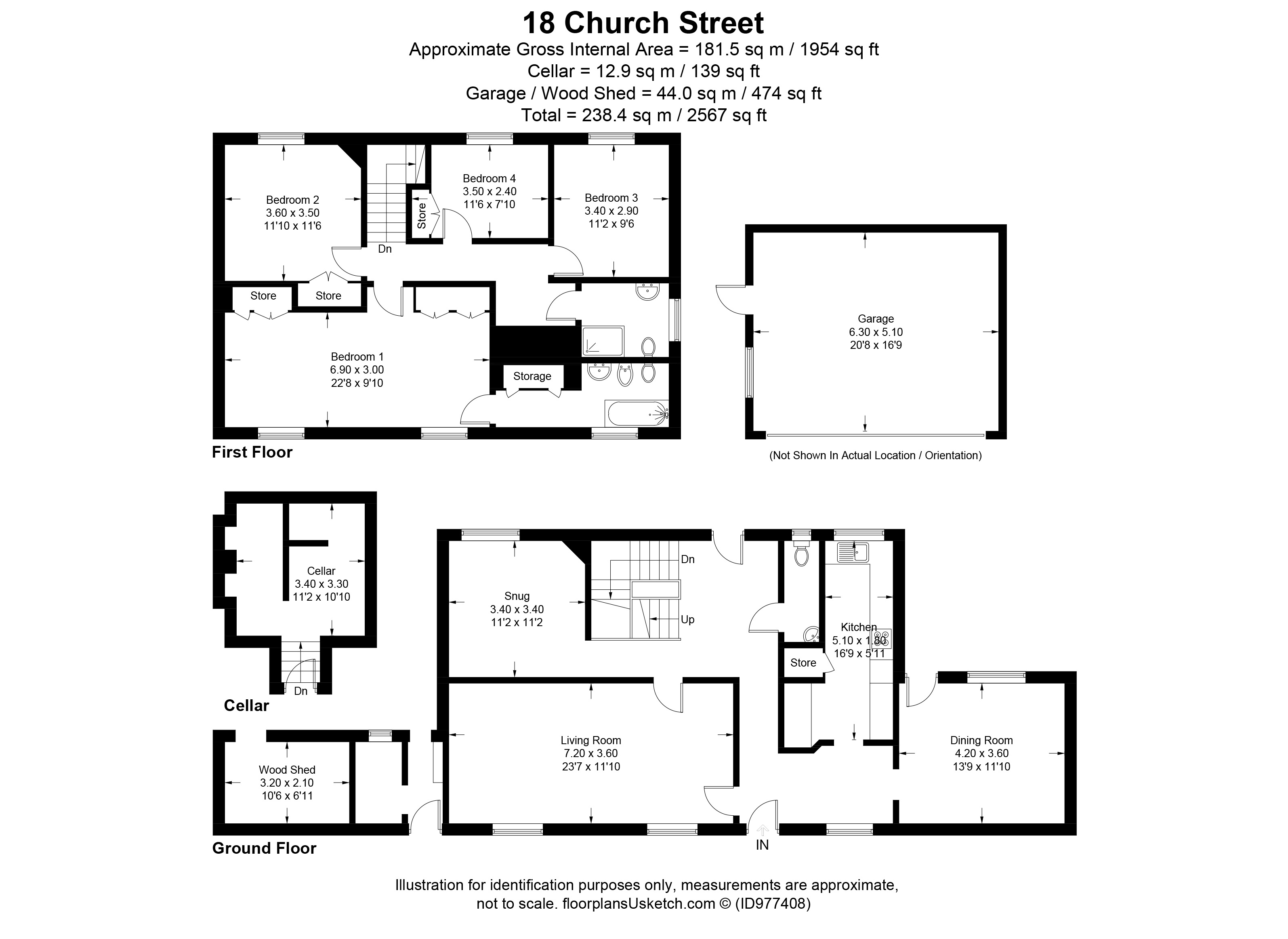 Double Garage : A detached garage with a remote controlled door, rear side door and windows. Pitched roof (potential loft storage space), power points and lighting. Space for a work bench and garden storage.