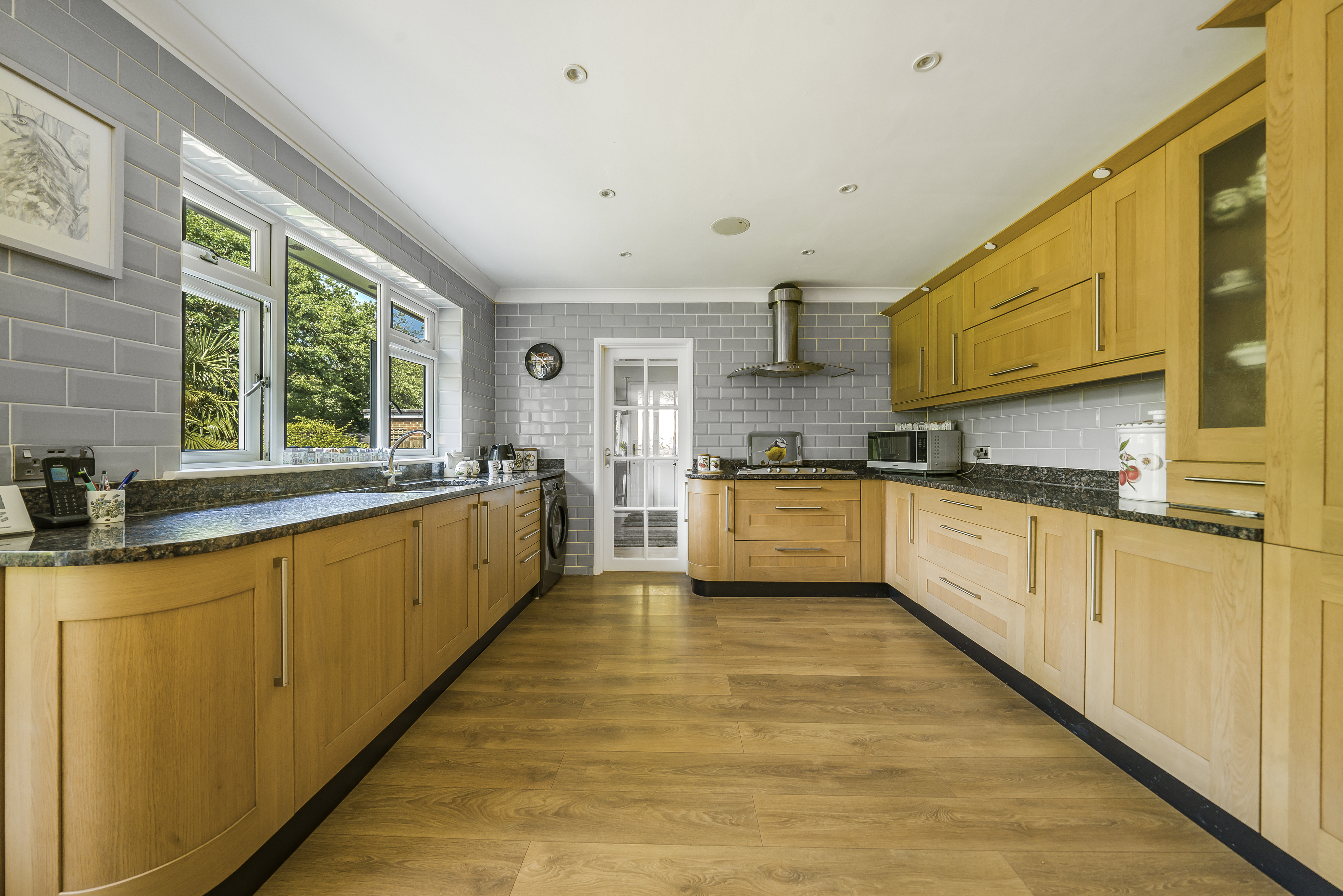Kitchen/Family Room : An outstanding feature at the core of the property - an excellent, modern family room with, to one end an informal seating/TV area and a central dining area - with glazed double doors out to a rear terrace and the garden. The kitchen area also enjoys fine views over the main garden and woodland beyond. Extensive range of wall and floor units with granite work surfaces. Double sink and drainer, built in fridge and freezer, oven and grill, gas hob and Zanussi extractor hood. Plumbing and space for a dishwasher.